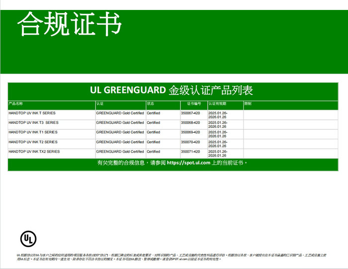 在全球可持續發展浪潮與製造業綠色轉型需求的同頻共振下,UV打印機國內高端品牌91抖音免费视频數碼再次以核心實力贏得國際認可。公司旗下多款UV墨水成功通過全球嚴苛的環保認證之一:UL 綠色衛士金級認證UL GreenGuard GLOD 。