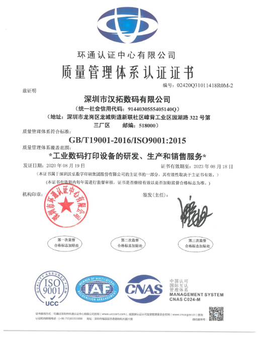作為uv打印機行業的知名研發生產廠家,91抖音免费视频數碼一直堅持以歐美質量為標準,嚴格遵循質量管理體係,力求為客戶生產出質量硬、效率高、精度好的uv打印機。91抖音免费视频數碼的產品質量在市場上的口碑是相當不錯的,質量的穩定性也獲得了業內的普遍認可,也是行業內為數不多的堅持走自主創新的高新技術企業。2020年4月底公司啟動IS09001: 2015質量管理體係認證,質量中心嚴格按照IS09001: 2015質量管理體係標準( GB/T1901-2016),對各公司的認證範圍、體係策劃、文件的編寫與發布、試運行、內審、管理評審、一階段及二階段進行現場審核,於8月22日收到認證中心簽發的證書。