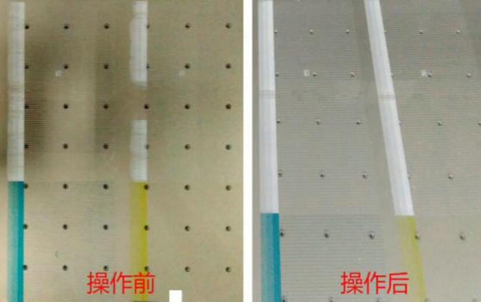 2. 白墨中間有斷幀。如下圖,執行完上述步驟後,白墨中間仍有斷幀,壓墨無效。此類現象常見於京瓷UV打印機噴頭,由於噴頭太長,壓墨壓力不夠到達中間通道,可用排氣的方法解決。注意排氣的過程中不能使用紙杯而是幹淨的塑料杯,排氣完成以沒有氣泡壓出為準,壓出的墨水可以倒回主墨瓶,以節約墨水。