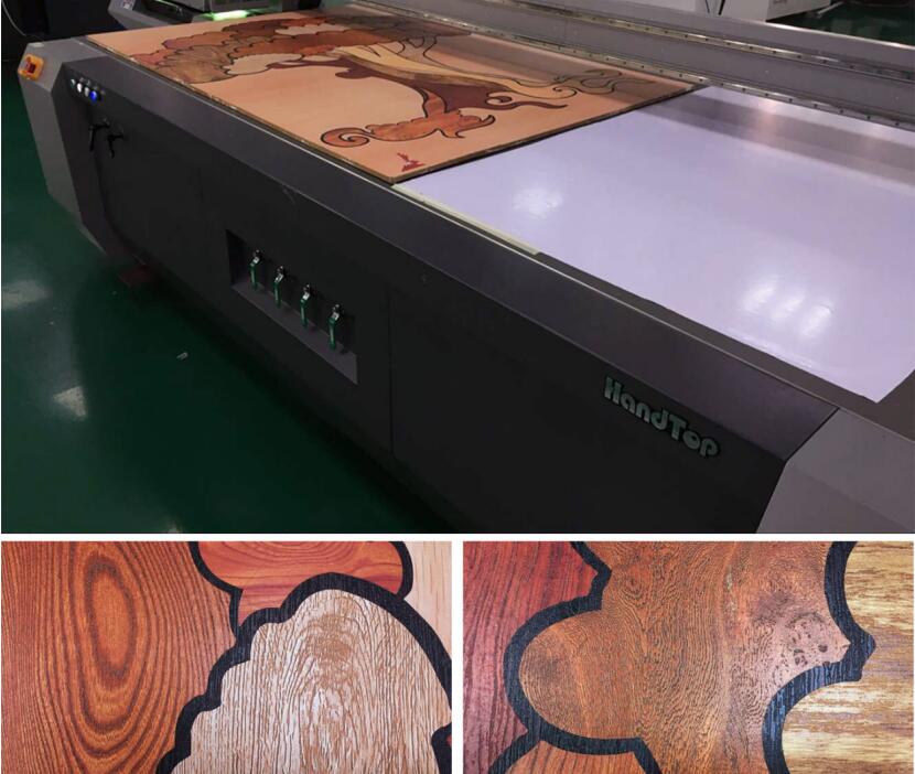 今天小編主要說說UV打印機在木紋拚花方麵有什麽特點和優勢?傳統的木紋拚花是指將不同類型的木紋拚接在木質基材上,工序複雜。隨著UV平板打印機的推廣,木紋拚花變得簡便了許多,隻需要在計算機設計好拚花圖案,即可在人造石、密度板等建材上打印出木紋拚花的效果。通過UV平板打印機噴印的木紋拚花產品如家具、地板不僅色彩豐富,紋理多樣,而且加上印前後處理後經久耐用、防水防腐。