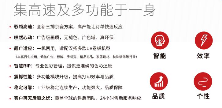 追求技術的卓越、做工的精細、客戶的滿意度,是京瓷60年一直向社會作出的承諾。作為京瓷全球重要合作夥伴,漢弘集團與之真誠合作十餘載,自主開發噴頭驅動技術,積累了十多年的高速工業噴頭研究和使用經驗。現在漢弘集團旗下的各產品線都配備了京瓷噴頭,91抖音免费视频數碼UV打印機將京瓷噴頭的應用提高到了一個新的高度,並且通過工藝、方案的不斷升級,使這類噴頭在速度和穩定性方麵有了質的提高。
