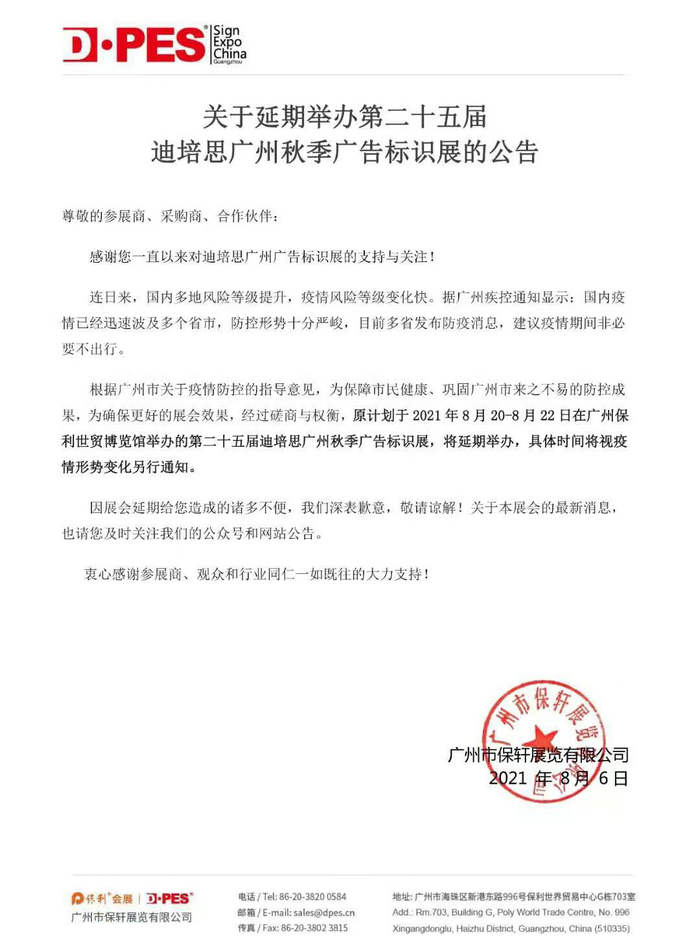 根據廣州市關於疫情防控的指導意見,為保障市民健康、鞏固廣州市來之不易的防控成果,為確保更好的展會效果,主辦方決定原計劃於2021年8月20-8月22日在廣州保利世貿博覽館舉辦的第二十五屆迪培思廣州秋季廣告標識展,將延期舉辦,具體時間將視疫情形勢變化另行通知。