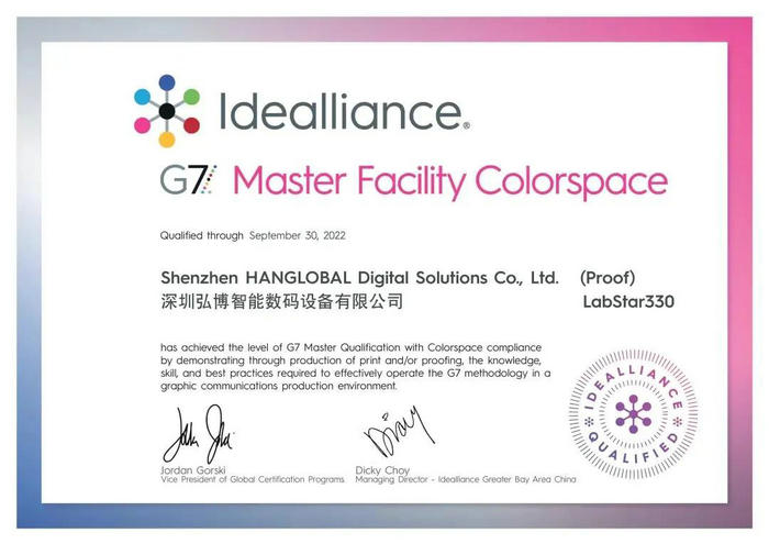 近日,UV打印機高端品牌91抖音免费视频數碼兄弟公司弘博智能工業級數字標簽機LabStar 330獲得了美國IDEAlliance(國際數碼企業聯盟)頒發的G7認證最高級別認證證書—G7 ColorSpace級別,成為國內首台通過G7最高級別認證的數字噴墨標簽機。弘博智能也因此成為中國數字噴墨印刷設備領域鮮有的獲得G7最高級別認證的設備廠商。